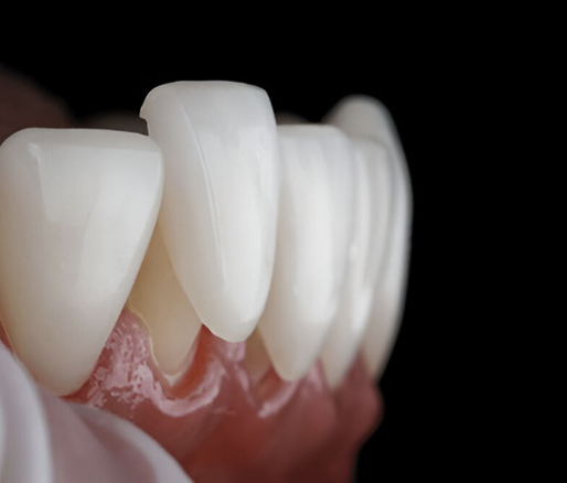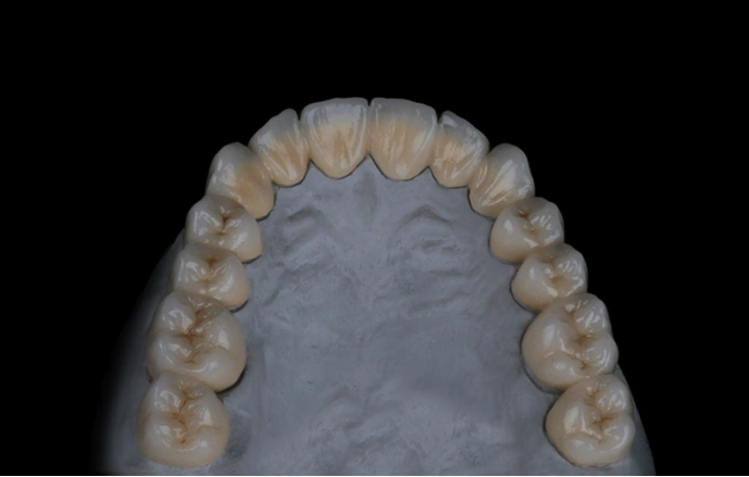 По сравнению с цирконием стеклокерамика обладает более высокой прозрачностью и характерным опаловым сине-белым оттенком на краях зубов. Многослойные CAD-модели в точности воспроизводят градиент перехода от дентина к эмали, а такие техники, как окрашивание и покрытие глазурью или формовка поверхности, позволяют придать конструкциям индивидуальный внешний вид. После полировки уровень глянца поверхности превышает 200 единиц по шкале Гу, что придает ей естественный «влажный» вид и снижает вероятность образования зубного налета.
